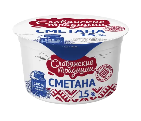 Сметана "Славянские традиции" изготавливается из пастеризованных сливок путем сквашивания их закваской, приготовленной на чистых культурах молочнокислых и ароматобразующих бактерий. Благодаря молочнокислому брожению сметана превращается в продукт пробиотического действия: содержащиеся в ней микроорганизмы помогают бороться с гнилостной флорой кишечника, расти и размножаться полезным бактериям.