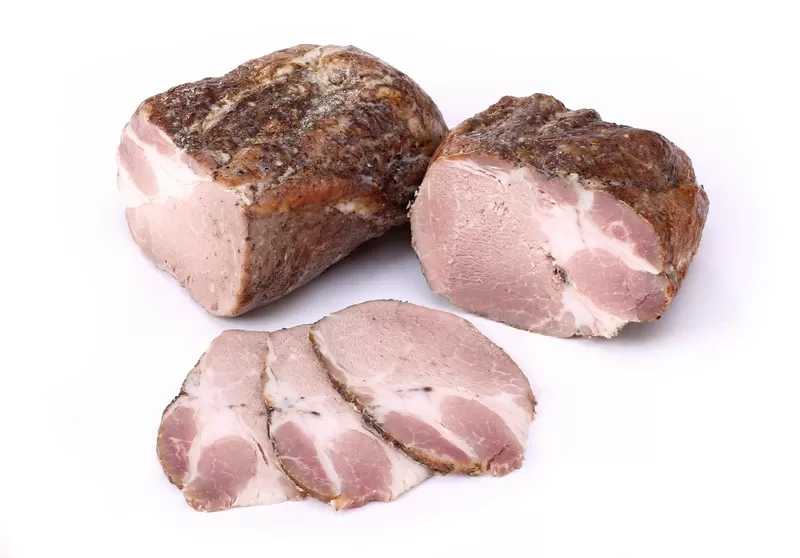 Состав: грудореберная часть свиная, соль, сахар, чеснок, майоран, смесь приправ, кориандр, лавровый лист, перец душистый, мускатный орех